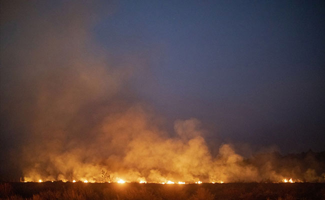 Trucks loaded with tree trunks are burned by agents of the Brazilian Institute for the Environment and Renewable Natural Resources. (Reuters)