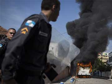 Policemen patrol near a burning bus after it was set on fire near the area recently occupied by squatters in Rio de Janeiro, Brazil on April 11, 2014. (File photo)