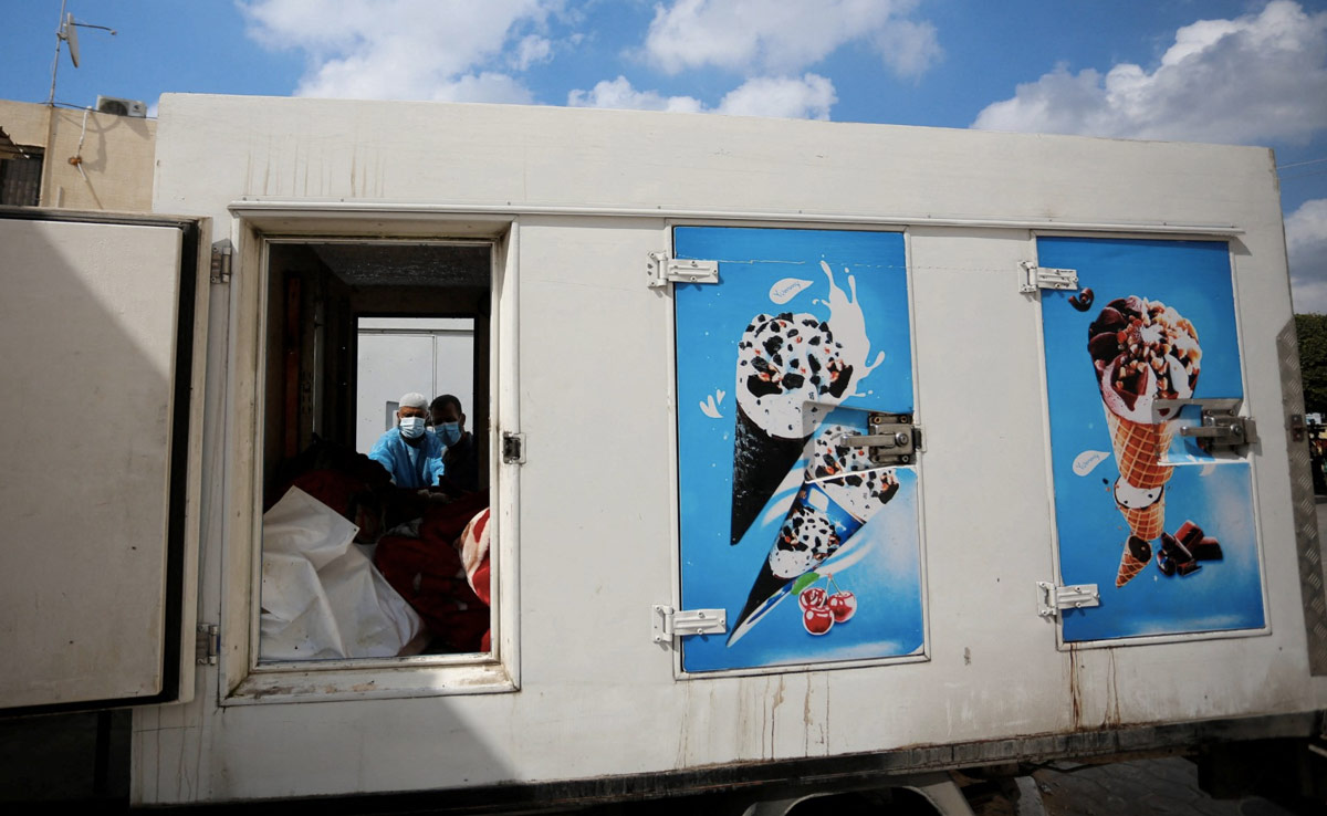 The freezer trucks, whose sides still show advertising images of smiling children enjoying ice cream cones, are normally used to make deliveries to supermarkets. Now they are makeshift morgues for victims of the devastating war between Hamas and the Israeli army.