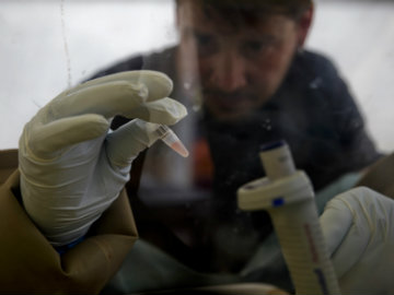 A scientist separates blood cells from plasma cells to isolate any Ebola RNA in order to test for the virus at the European Mobile Laboratory in Gueckedou April 3, 2014.