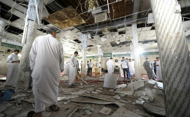 Saudi men gather around debris following a blast inside a mosque, in the mainly Shiite Saudi Gulf coastal town of Qatif, 400 kms east of Riyadh, on May 22, 2015. (AFP Photo)