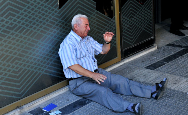 Giorgos Chatzifotiadis, sitting on the ground crying outside a national bank branch, as pensioners (unseen) queue to withdraw their pensions on July 3, 2015. (Agence France-Presse)