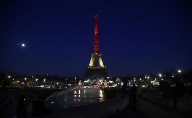A picture taken on March 22, 2016 shows the Eiffel Tower in Paris illuminated in colours of the Belgian flag in tribute to the victims of terrorist attacks in Brussels. (AFP Photo)