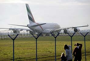 A couple with a small child watches an Emirates Airbus A380 flying from Dubai to Amsterdam sitting on the runway after an emergency landing at Prague's Vaclav Havel Airport. Credit: The Associated Press