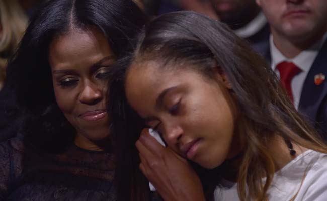 Outgoing US President Barack Obama's elder daughter Malia was moved to tears as her father dedicated several minutes of his farewell address in Chicago to thank his wife Michelle Obama and his daughters Malia and Sasha for their contribution during his tenure. Malia, who sat next to her mother, was seen with moist eyes as an emotional POTUS called Michelle his "best friend".