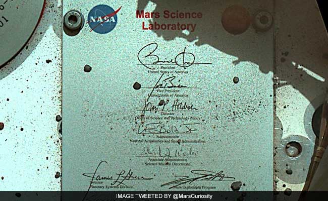 Curiosity Mars rover's Twitter handle @MarsCuriosity on Thursday posted a photo of a plaque bearing the signatures of Obama, Vice President Joe Biden and other US officials. "Signed, sealed, delivered. I carried @POTUS's signature to the surface of #Mars.
