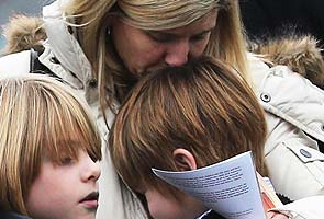 A woman comforts a boy as mourners depart Honan Funeral Home after the funeral for six-year-old Jack Pinto in Newtown, Connecticut.