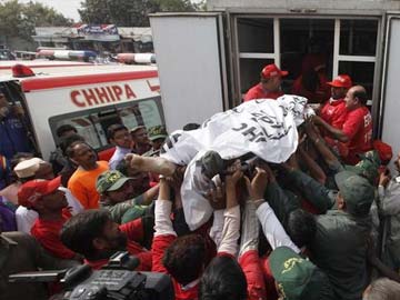 Rescue workers move the body of a police officer, who was killed in a bomb blast on a bus, in a mortuary van outside Jinnah Postgraduate Medical Centre Hospital morgue in Karachi.