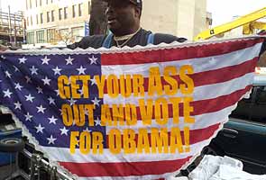 Street vendors had it all - badges, shoes, caps, t-shirts, mugs, CDs of the presidential speech in 2008. Also, a Democrat supporter holding up a huge banner in the shape of underwear with an American flag printed on it. 'Get your ass out and vote for Obama' was the message, in bold.