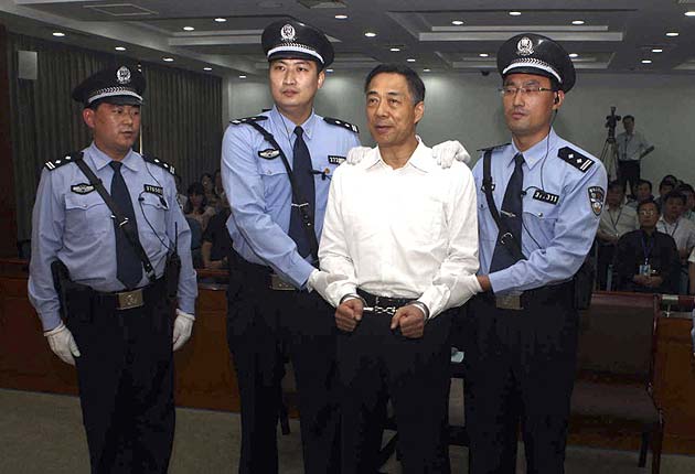 Bo Xilai is handcuffed and held by police officers as he stands at the court in Jinan, in eastern China's Shandong province