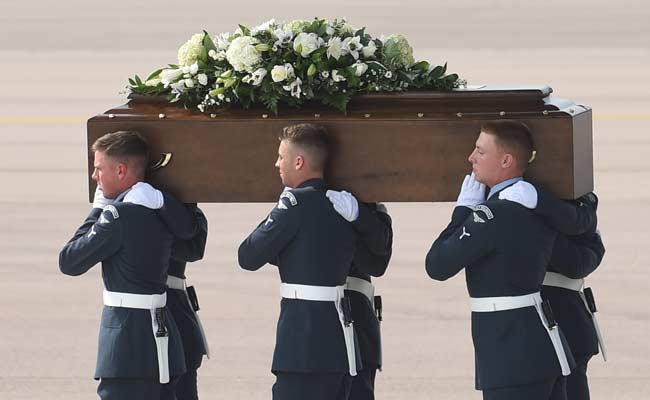 The bodies arrived at RAF Brize Norton northwest of London, where white-gloved pall-bearers in air force uniforms linked arms to carry each coffin to a hearse waiting near the runway.