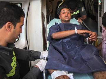 Members of the Egyptian Civil Protection Authority lift an injured man who was wounded during a bomb attack targeting a traffic security post near a courthouse in Cairo's Heliopolis district on May 2, 2014.