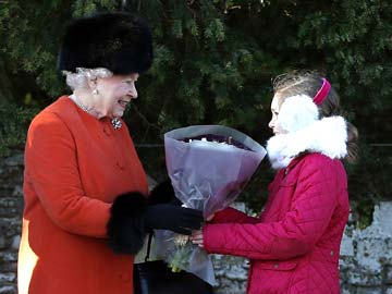 Britain's Queen Elizabeth II (L) receives a bouquet of flowers following a traditional Christmas Day Church Service at Sandringham in eastern England, on December 25, 2013
