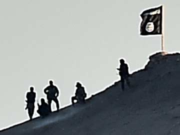 Alleged Islamic State militants stand next to an IS flag atop a hill in a Syrian town. (Agence France-Presse)