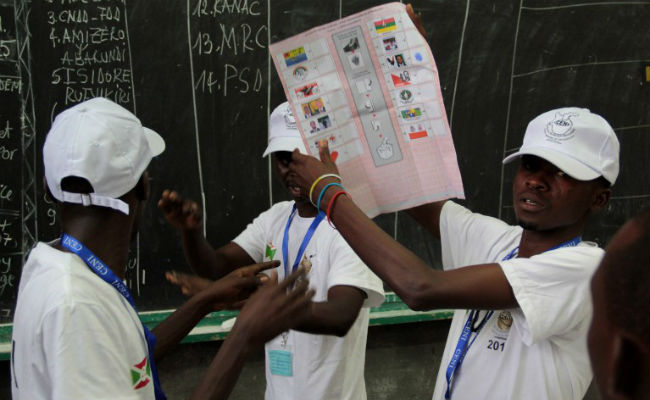 Staff from the independent national electoral commission (CENI) count ballots in the neighbourhood of Nyakabiga, during the parliamentary and local elections on June 29, 2015. (AFP)
