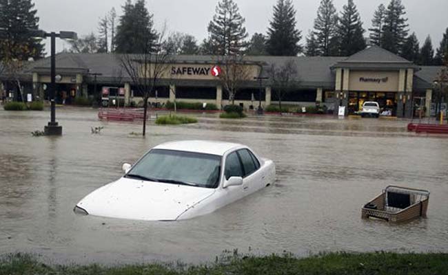 A car and shopping cart are submerged in water at a flooded shopping center in Healdsburg, California (Associated Press photo)