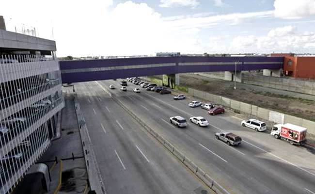 Photo taken in Tijuana, Mexico, vehicles pass under a walking bridge that connects the new Cross Border Xpress air terminal in San Diego, right, to the Tijuana International Airport, left. (Associated Press)