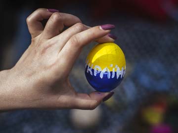 A woman holds a wooden Easter egg painted with the colors of the Ukrainian flag during a pro-Ukrainian rally in the eastern Ukrainian city of Lugansk, on April 19, 2014.