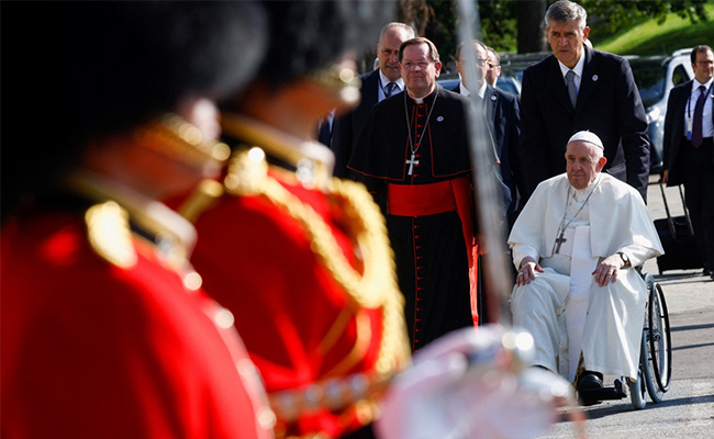 At the Citadelle, Trudeau, who has made reconciliation with Canada's indigenous peoples one of his political priorities, and Simon greeted the pope along with an honor guard wearing red uniforms and black bearskin caps.
