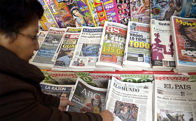 Newspapers with the frontpage featuring the symbolic Catalonian independence vote at a newstand in Madrid. (Agence France-Presse)