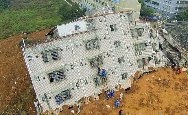 Rescue workers near the damaged building after a landslide hit an industrial park in Shenzhen in China.