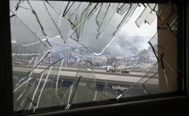 A window shattered by the shockwaves frames the site of an explosion at a warehouse in northeastern China's Tianjin municipality.(AP)