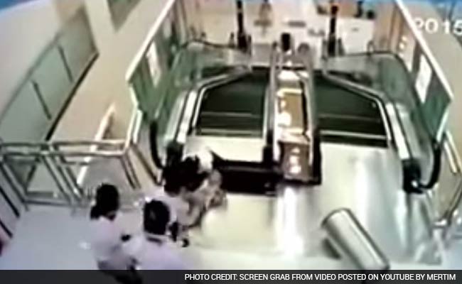 Surveillance footage from the incident that happened yesterday shows a metal panel at the top of the escalator giving way, causing the woman and her toddler to stumble.