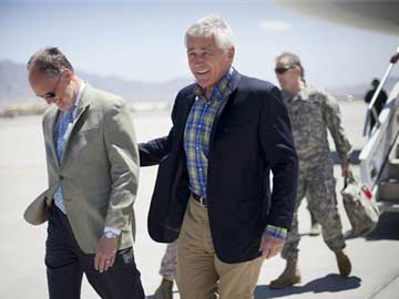 US Defence Secretary Chuck Hagel, right, walks on the tarmac with U.S. Ambassador to Afghanistan James Cunningham, left, during his arrival to Bagram Airfield in Afghanistan, Sunday, June 1, 2014.