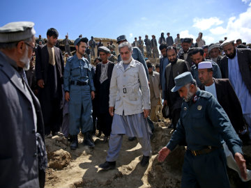 Afghan presidential candidate Abdullah Abdullah, center, visits the site of Friday's landslide that buried Abi-Barik village in Badakhshan province, northeastern Afghanistan, Tuesday, May 6, 2014
