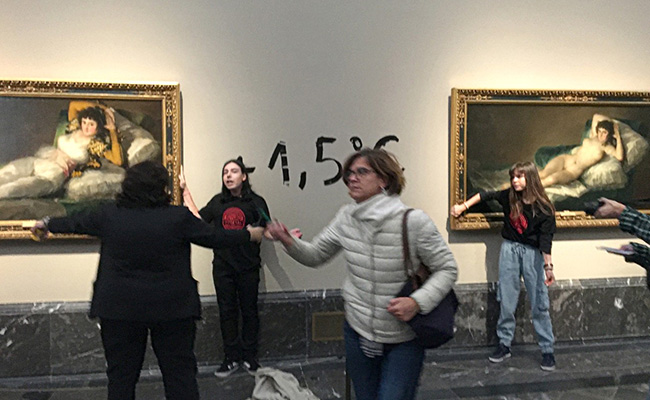 Two climate activists on Saturday each glued a hand to the frames of two paintings by Spanish master Francisco Goya at the Prado museum in Madrid, police said.