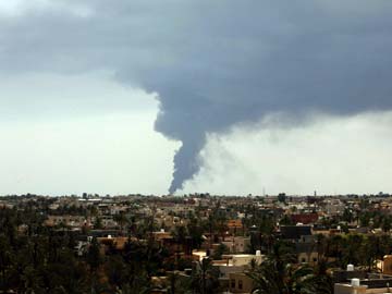 Plumes of smoke rise in the sky after a rocket hit a fuel storage tank near the airport road in Tripoli, during clashes between rival militias on July 28, 2014.