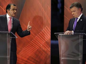 presidential candidate Oscar Ivan Zuluaga, left, points as he faces Colombia's President Juan Manuel Santos during a televised debate in Bogota, Colombia.