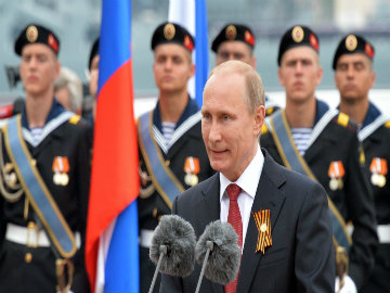 Russian President Vladimir Putin speaks during his visit to the Crimean port of Sevastopol on May 9, 2014. Putin's visit to Crimea, which was annexed by Moscow in March