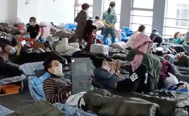 Separated by less than an arm's length, people at a quarantine facility in the Chinese city of Shanghai after testing positive for COVID-19 lie in rows of grey camp beds, suitcases and other belongings strewn next to them.
