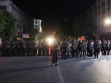 Myanmar police force stand guard on the street of Mandalay in central Myanmar early on July 2, 2014. Myanmar police fired warning shots after an angry mob attacked Muslim property in the central city of Mandalay, authorities said, in the latest eruption o
