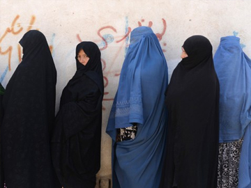fghan voters queue prior to casting their ballot at a polling station in Kabul on June 14, 2014