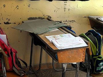 Shards of glass on classroom table after a bomb explosion rocked the heart of Damascus on November 6 (AFP)