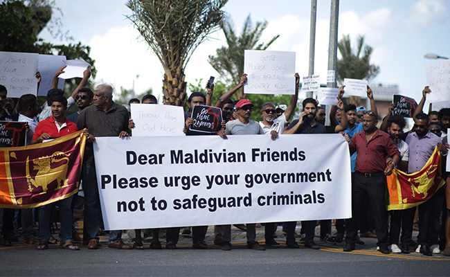 "Dear Maldivian friends, please urge your government not to safeguard criminals," said a black and white banner held by Sri Lankans working in the islands' tiny capital.