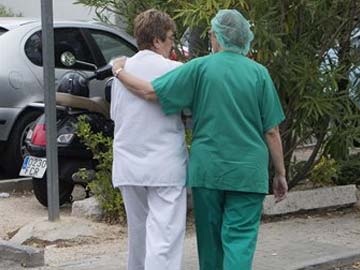 Hospital staff members walk back into the hospital in Madrid, where Ebola infected Spanish nurse is being treated. (Associated Press)