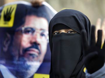 A supporter of Egypt's ousted President Mohammed Morsi raises his poster and her hand with four raised fingers