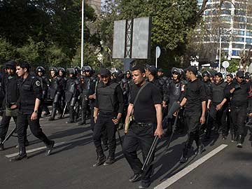 Egyptian riot policemen march forward along a street leading to the Cairo University.