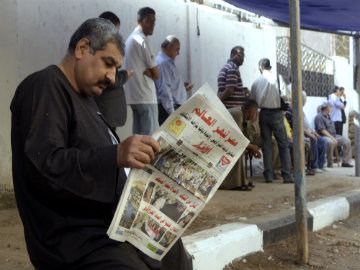 An Egyptian man reads a local newspaper with the headline in Arabic reading, "Egypt surprises the world," outside a polling station in Cairo, Egypt, Tuesday, May 27, 2014.