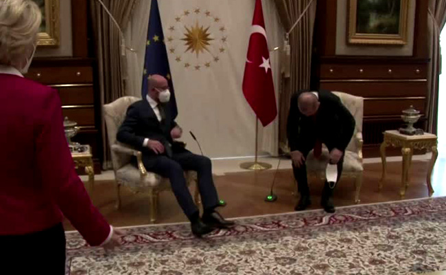 Footage from their meeting on Tuesday showed the first female head of the EU executive, the only woman in the talks, gesturing in disbelief and uttering a surprised sigh as Erdogan and European Council President Charles Michel took the two centre-stage seats prepared, relegating her to an adjacent sofa.