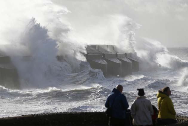 People watch the waves batter into the sea wall of a marina in Brighton, south England, on Monday