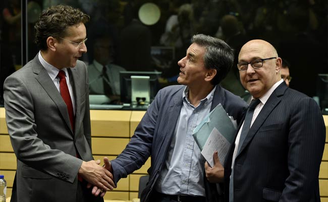 Dutch Finance Minister and president of the Eurogroup Jeroen Dijsselbloem (L) shakes hands with newly appointed Greek Finance Minister Euclid Tsakalotos (C). (AFP Photo)