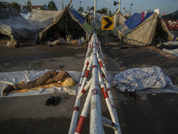 On the edge of the protest site, men line up every day near a burst pipe and take showers one by one. Women complain that they have hardly showered more than a few times in the last month. Some fear an outbreak of mosquito-borne dengue fever among the protesters.
