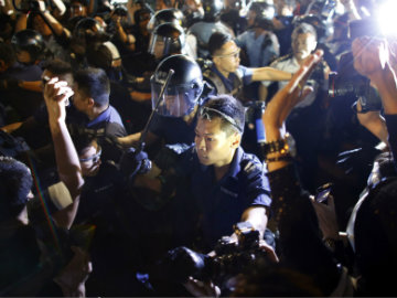 Police try to disperse the crowd near the government headquarters in Hong Kong (Reuters)