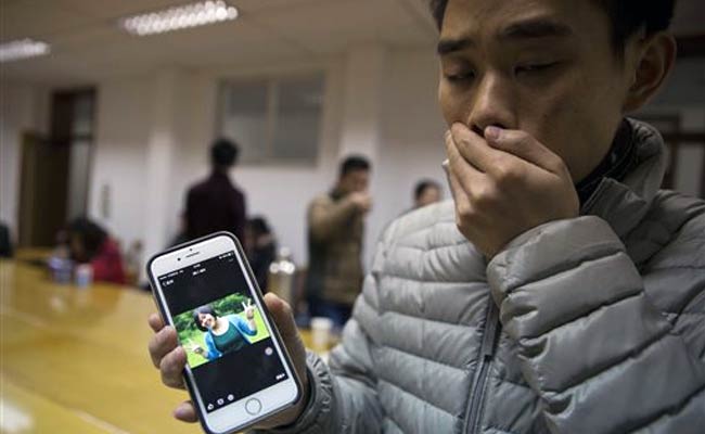 Zhao Weiwei holds up a phone to show a photo of his girlfriend Pan Haiqin who was killed in the deadly stampede in Shanghai. (Associated Press)