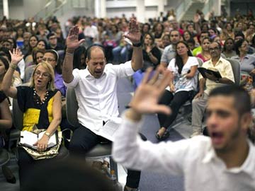 Faithful raise their hands in prayer as they listen to Pentecostal pastor Silas Malafaia's preaching in Rio de Janeiro, Brazi. (Associated Press)
