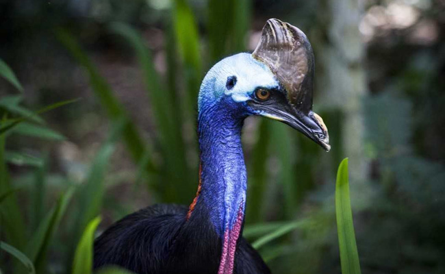 Cassowaries, of which there are three species, are native to the tropics of Queensland, Australia and New Guinea. They are a relative of ostriches, emus and rheas. Thick black feathers cover their bodies, from which a cobalt blue and vibrant red neck protrudes, leading to a head adorned with a keratin "casque," or crest.